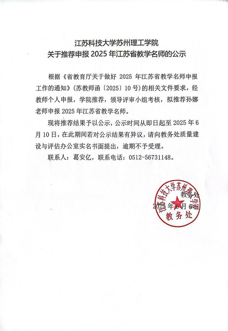 星空娱乐手机版下载官网关于推荐申报2025年江苏省教学名师的公示